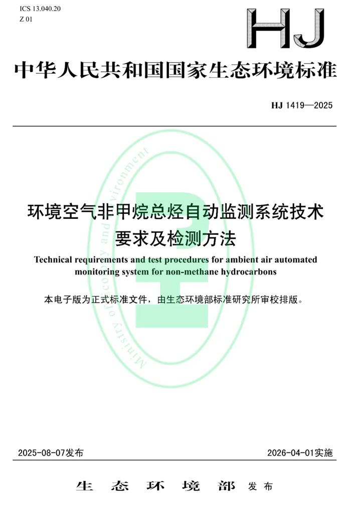 為貫徹《中華人民共和國環(huán)境保護法》《中華人民共和國大氣污染防治法》,防治生態(tài)環(huán)境污染,改善生態(tài)環(huán)境質(zhì)量,規(guī)范環(huán)境空氣非甲烷總烴自動監(jiān)測系統(tǒng)的技術(shù)性能,生態(tài)環(huán)境部制定國家生態(tài)環(huán)境標(biāo)準(zhǔn)《環(huán)境空氣非甲烷總烴自動監(jiān)測系統(tǒng)技術(shù)要求及檢測方法(HJ 1419—2025)》。本標(biāo)準(zhǔn)為首次發(fā)布,自2026年4月1日起實施。