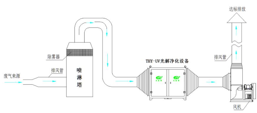 第一階段:廢氣經(jīng)過一級水噴淋對廢氣中氨、醇等易溶于水的成分以及灰塵進行去除預處理,再進入下一道工序。
