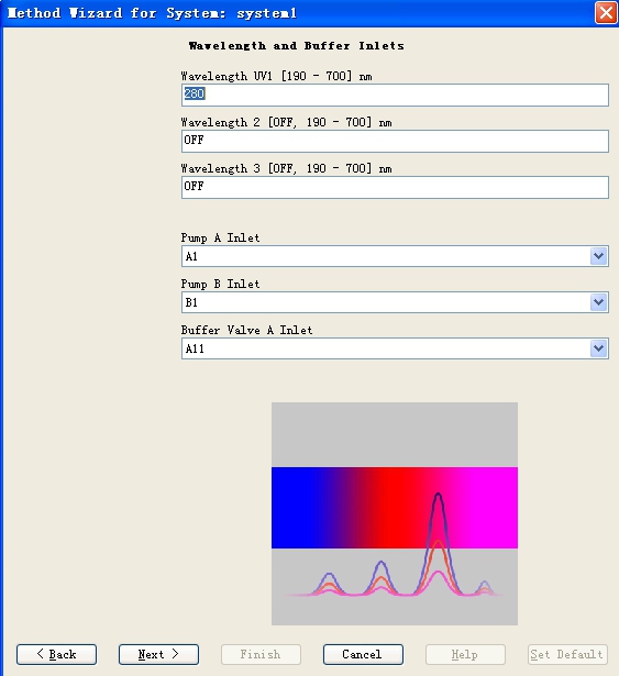 蛋白純化系統(tǒng)的程序設(shè)定操作在method editor窗口點(diǎn)擊工具欄內(nèi)的method wizard,彈出窗口界面如Fig 11所示,可以分別在main selection、column以及column position三個(gè)下拉菜單中選擇所要用到的層析方法、所用到的層析柱的參數(shù)以及所安裝的層析柱在柱位選擇閥的位置,選好之后,點(diǎn)擊next按鈕進(jìn)入下一步波長和溶液進(jìn)口的設(shè)定(Fig 12),在此可以設(shè)定檢測的波長,針對(duì)AKTA EXPLORER可以一次選擇三個(gè)波長共同進(jìn)行監(jiān)控,并在此設(shè)定A泵和B泵的溶液進(jìn)口,設(shè)定好之后,點(diǎn)擊next,出現(xiàn)如Fig 13所示窗口,可以在此設(shè)定對(duì)層析柱進(jìn)行平衡的條件。