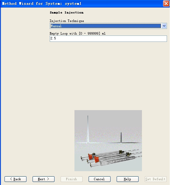完成之后,點(diǎn)擊next出現(xiàn)Fig 14的窗口,在此可以設(shè)定上樣的條件,可選擇的條件包括上樣的方式,如上樣環(huán)上樣以及樣品泵上樣,對(duì)上樣的體積也要進(jìn)行設(shè)定。如果利用系統(tǒng)泵上樣,在此無法進(jìn)行設(shè)置,不過可以利用A泵和B泵的兩個(gè)進(jìn)口在后面的步驟中進(jìn)行設(shè)置。